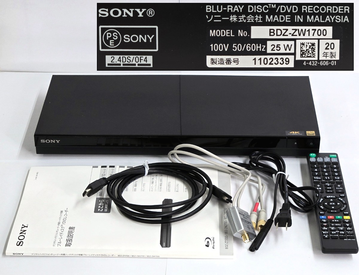 SONY ソニー ブルーレイ/DVDレコーダー BDZ-ZW1700 1TBハードディスク搭載 取説付